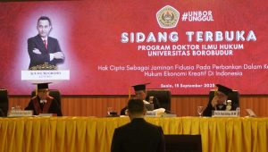Promovendus Agung Nugroho, SH., MH., berhasil mempertahankan disertasi berjudul “Hak Cipta sebagai Jaminan Fidusia pada Perbankan dalam Kepastian Hukum Ekonomi Kreatif Indonesia” pada Ujian Terbuka Promosi Doktor Ilmu Hukum di Universitas Borobudur.